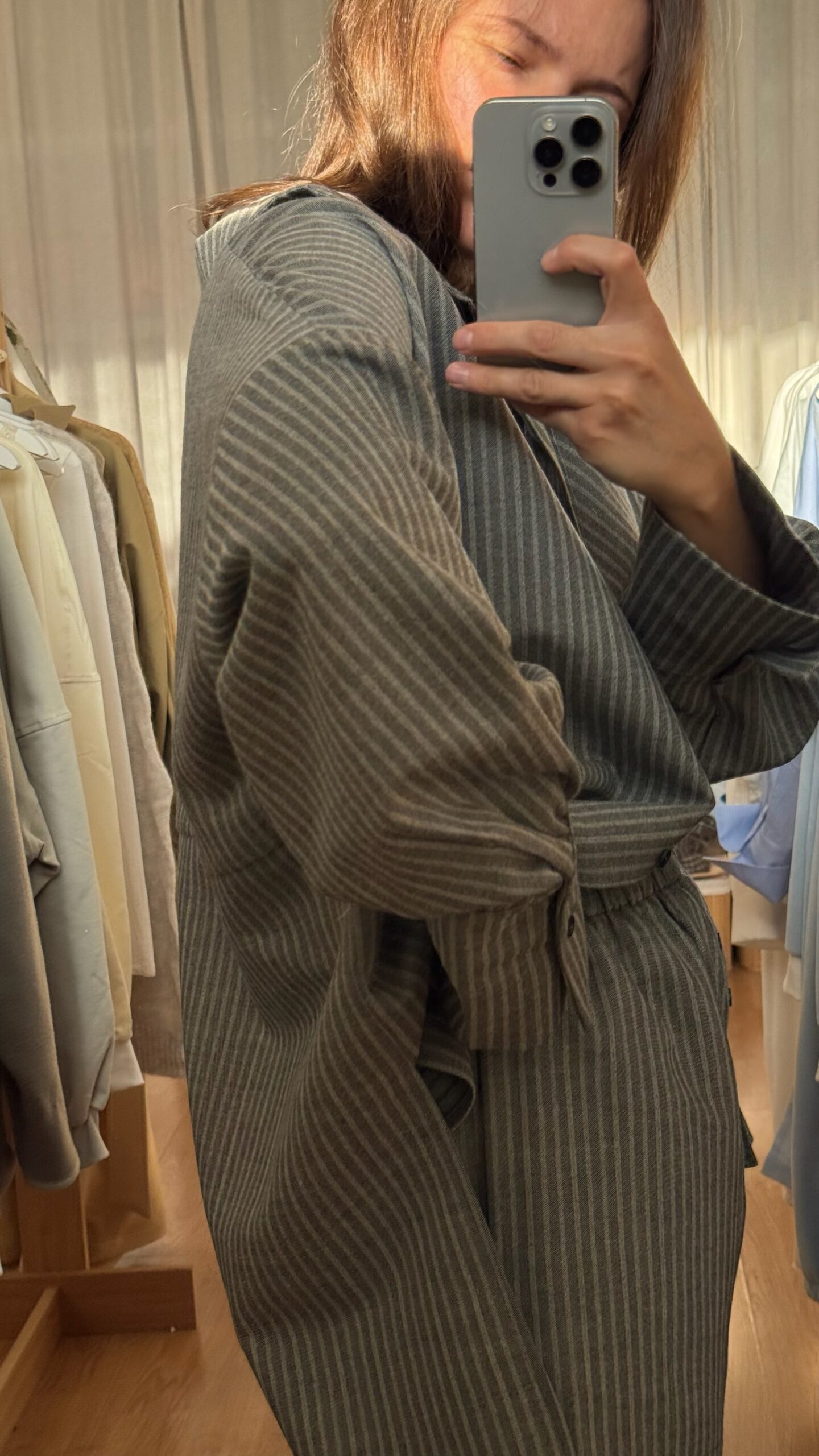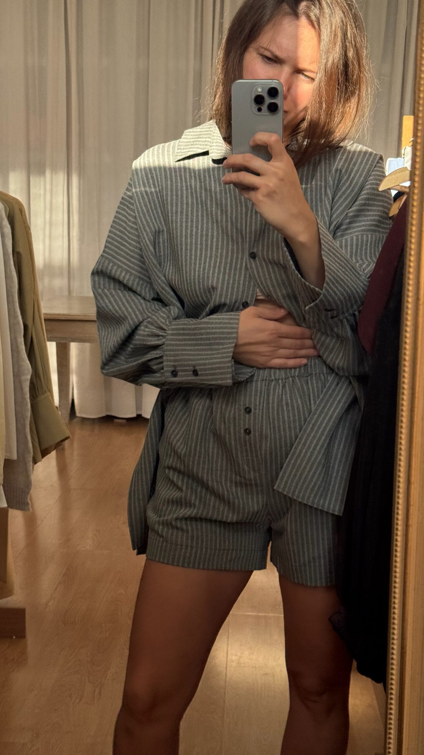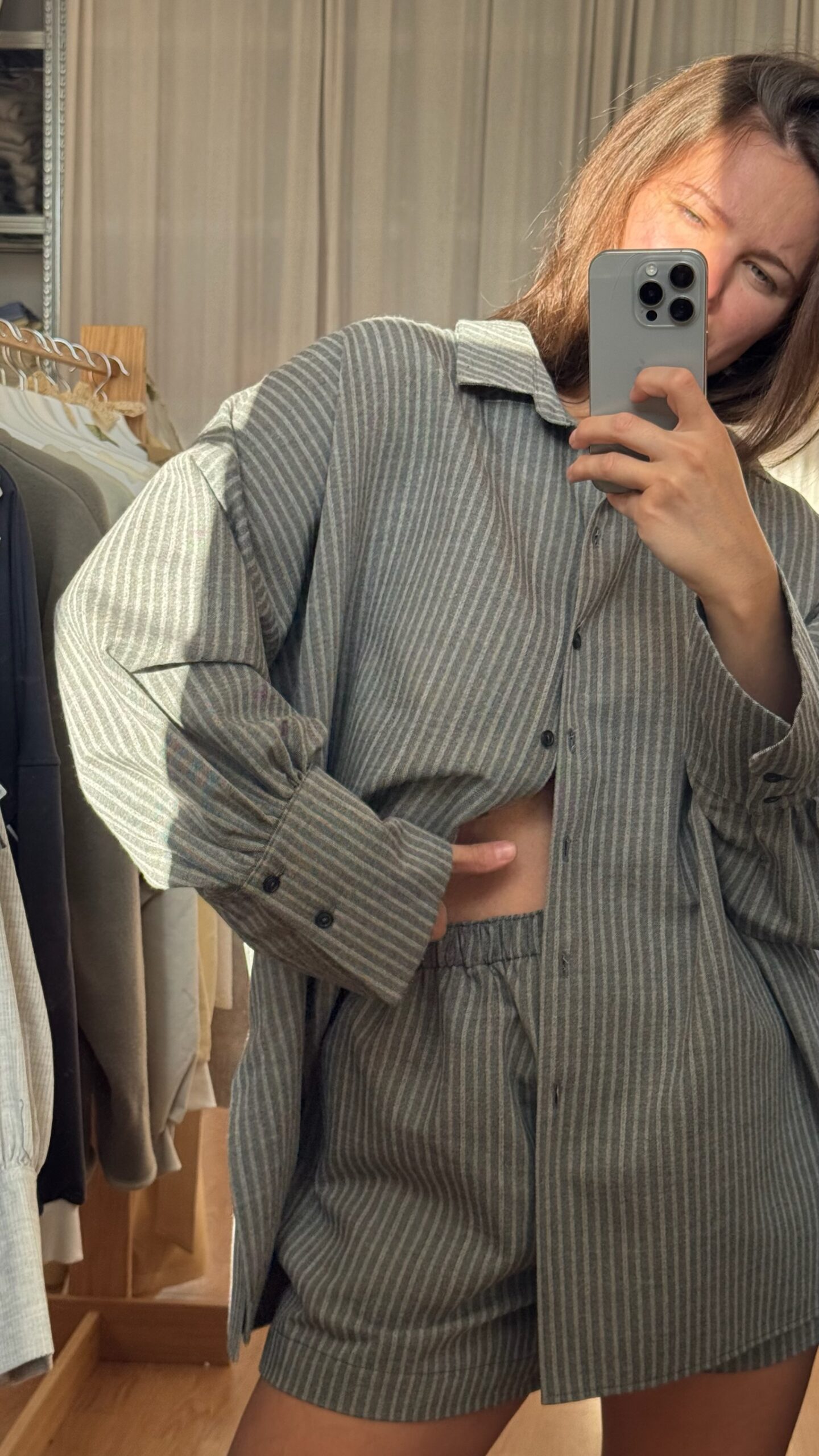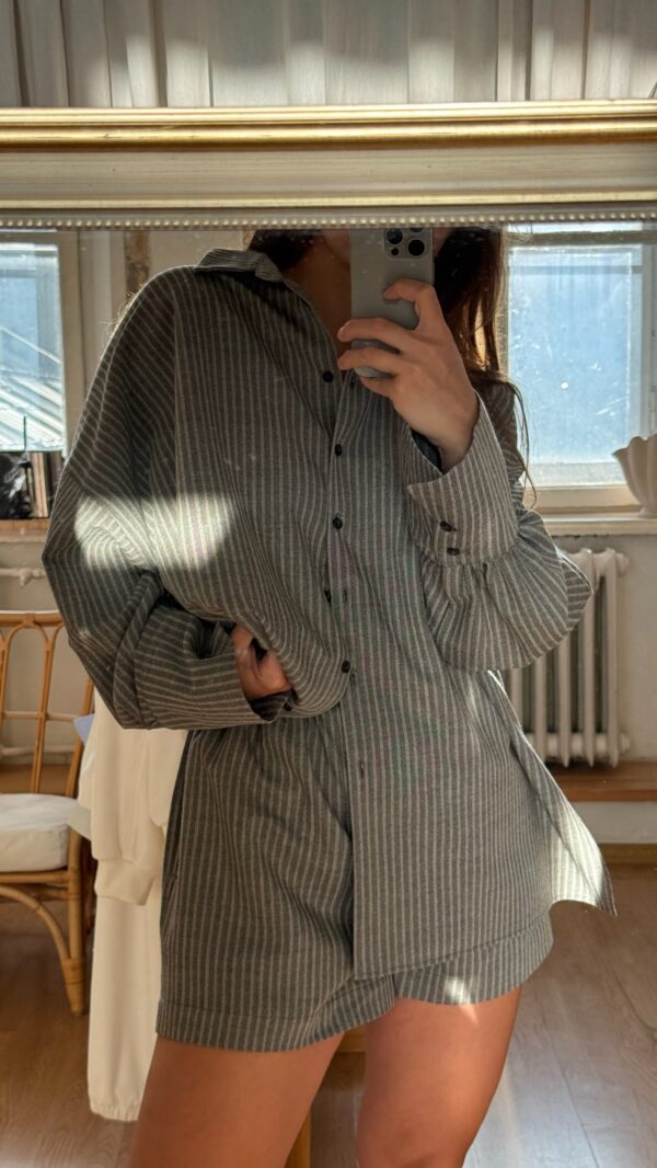 Šie boxer stiliaus šortai tęsia tą pačią tyliai prabangios estetikos istoriją kaip ir derantys marškiniai. Pasiūti iš 100% vilnos, jie suteikia natūralios šilumos, bet kartu ir išlaiko dailią, struktūruotą formą. Elastinga juosmens juosta ir dvi mažos sagutės priekyje užtikrina komfortą ir suteikia jaukumo, o stilingo pilko atspalvio dryžuotas audinys kuria atpažįstamą egzt nuotaiką – modernią, santūrią ir užtikrintą. Derink juos su tos pačios linijos marškiniais vientisam įvaizdžiui arba su jau pamėgtais kasdieniais drabužiais, kai norisi jaustis patogiai, bet visada stilingai.