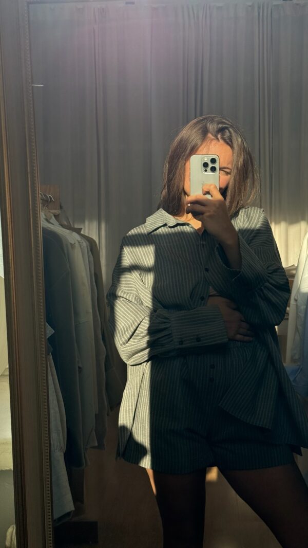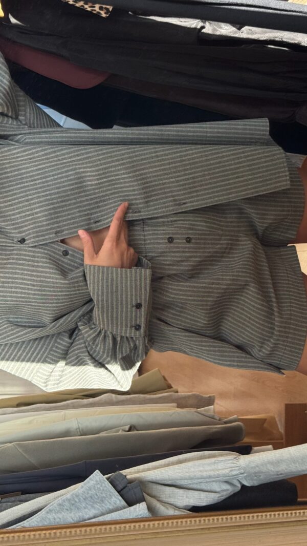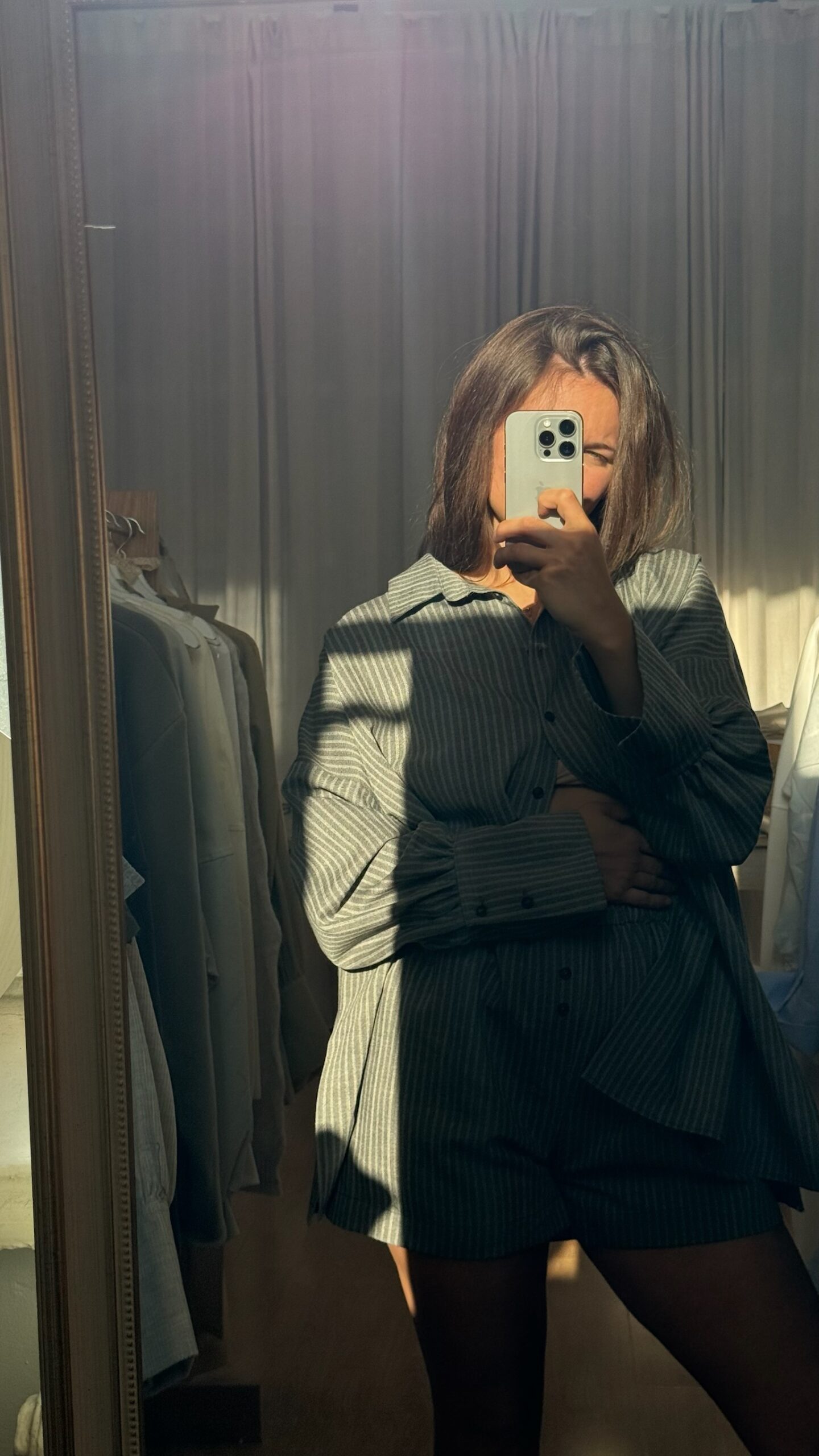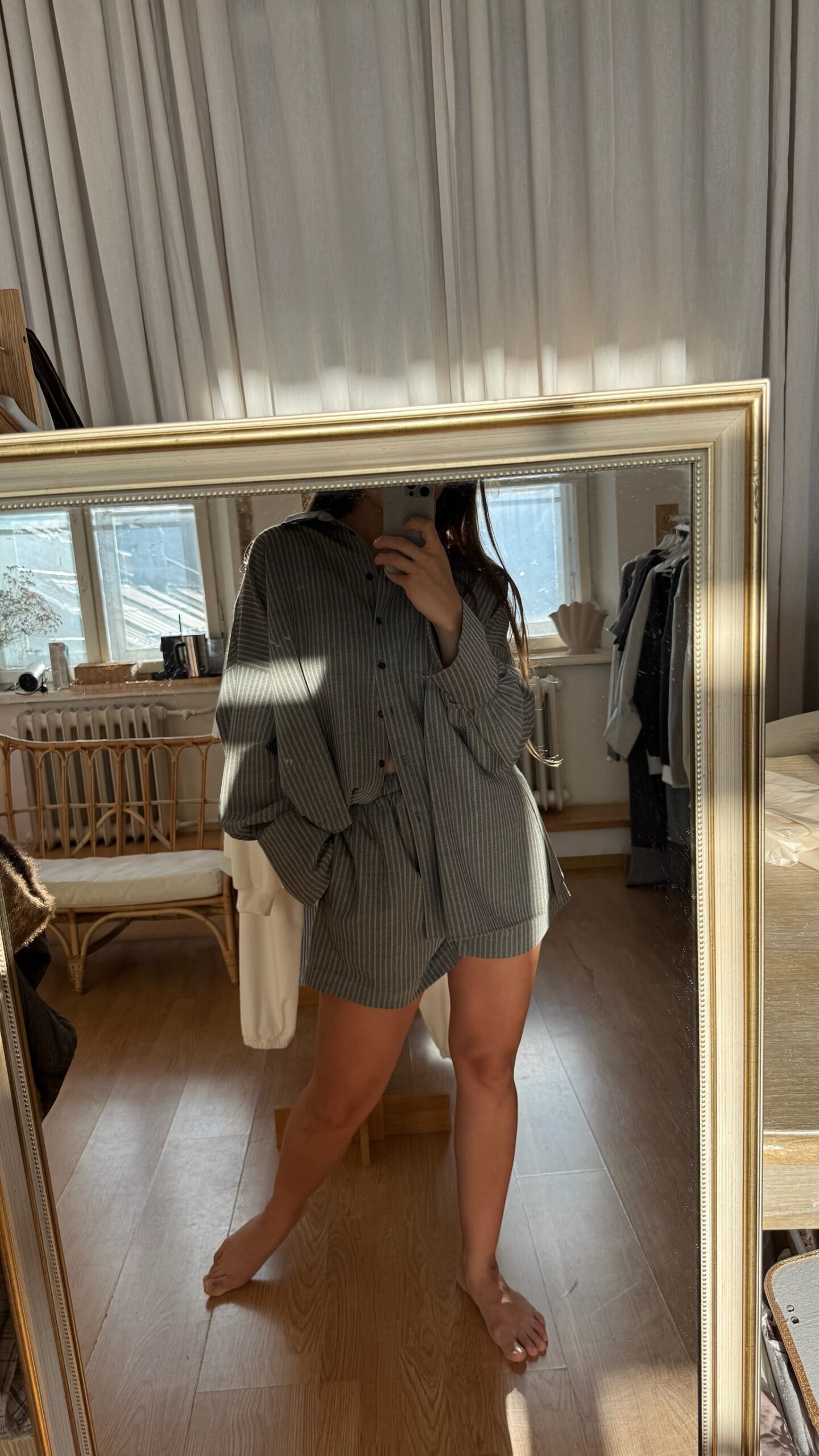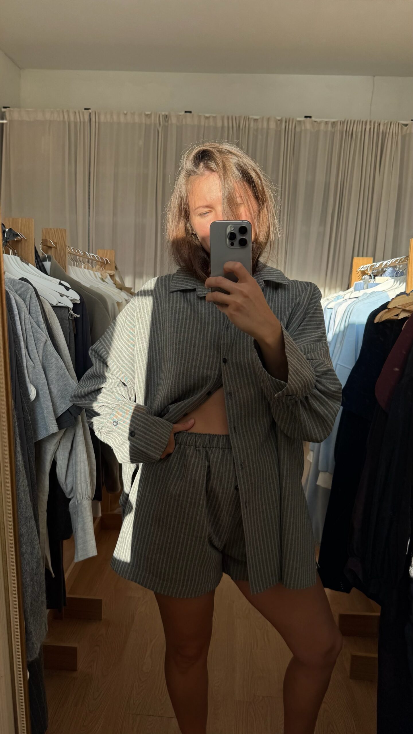 Šie boxer stiliaus šortai tęsia tą pačią tyliai prabangios estetikos istoriją kaip ir derantys marškiniai. Pasiūti iš 100% vilnos, jie suteikia natūralios šilumos, bet kartu ir išlaiko dailią, struktūruotą formą. Elastinga juosmens juosta ir dvi mažos sagutės priekyje užtikrina komfortą ir suteikia jaukumo, o stilingo pilko atspalvio dryžuotas audinys kuria atpažįstamą egzt nuotaiką – modernią, santūrią ir užtikrintą. Derink juos su tos pačios linijos marškiniais vientisam įvaizdžiui arba su jau pamėgtais kasdieniais drabužiais, kai norisi jaustis patogiai, bet visada stilingai.