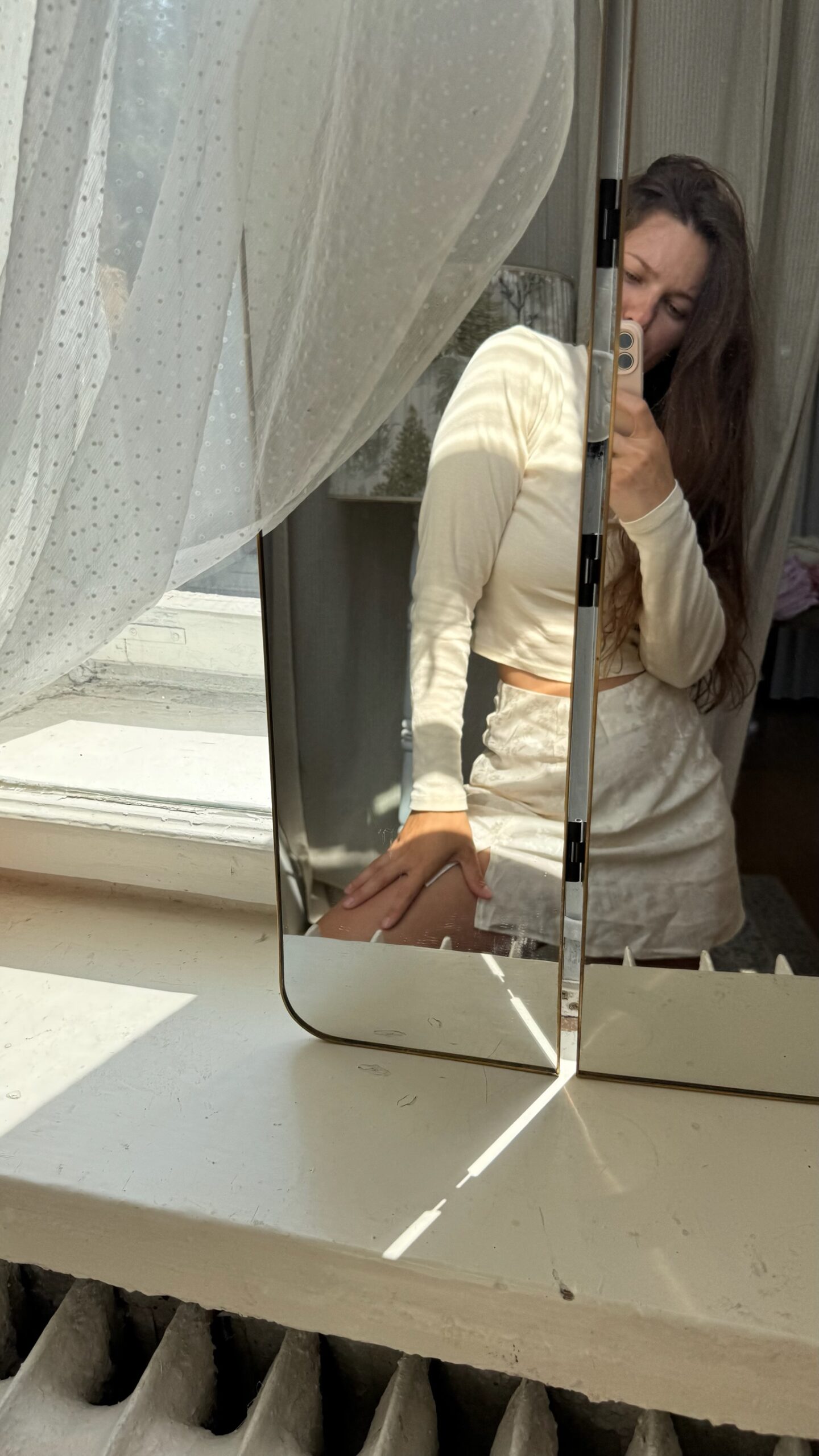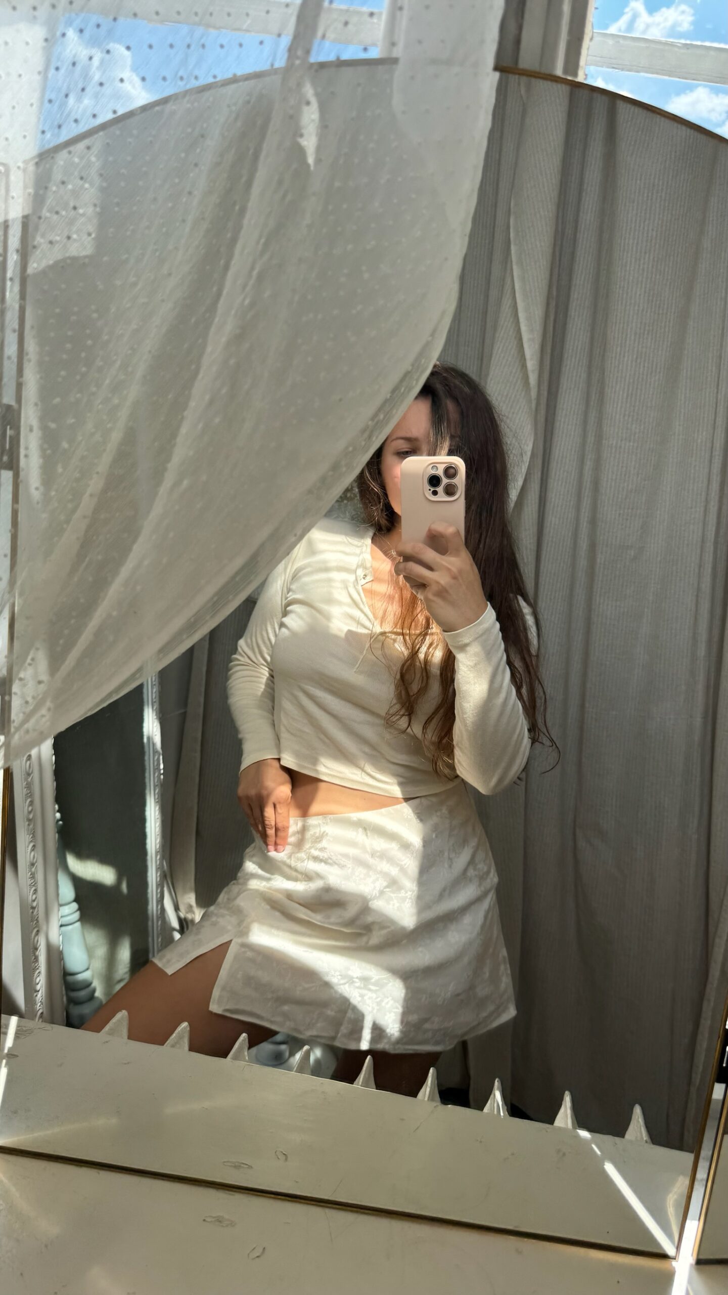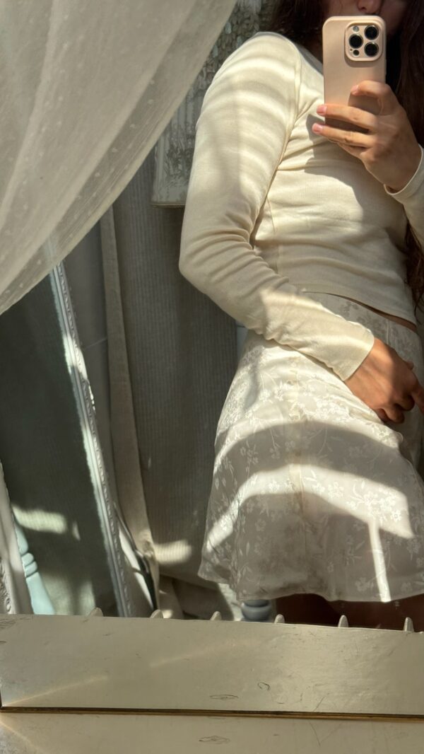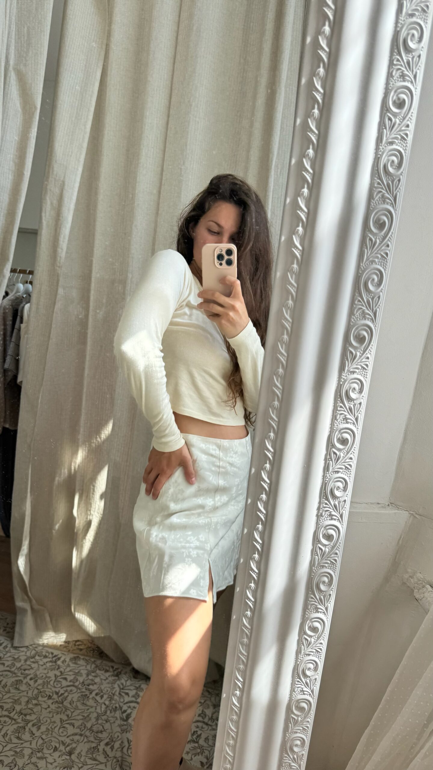 Paprastas, bet be galo žavus ir neįtikėtinai mielas. Šis švelniai perlamutrinio žakardo audinio sijonas lyg audinyje nutapyta rytinė šviesa – švelnus, švytintis ir tyliai užburiantis. Įsivaizduok save ilsintis po palme ar vaikščiojant saulės nušviestomis senamiesčio gatvėmis, prikaustant žvilgsnius kiekviename žingsnyje.