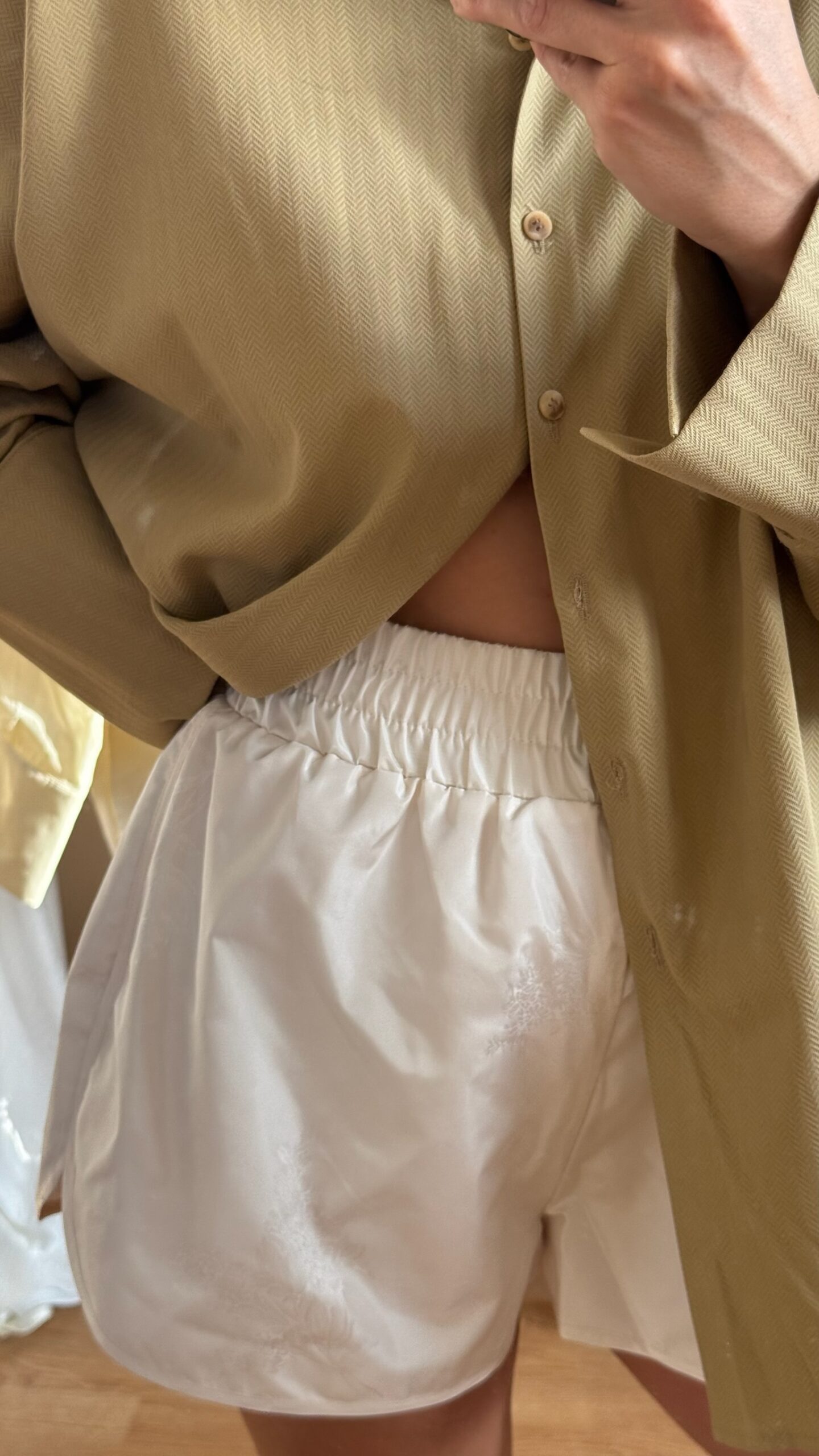 Šie boxer stiliaus šortai sujungia komfortą su itin subtiliomis, romantiškomis detalėmis. Pagaminti iš gryno šilko, jie švelniai glosto tavo odą. Sniego baltumo atspalvis, derinamas su subtiliu žakardiniu gėlių siuvinėjimu, suteikia išskirtinės elegancijos, kuri, atrodo, ir laikui nepavaldi, ir nepriekaištingai rafinuota.