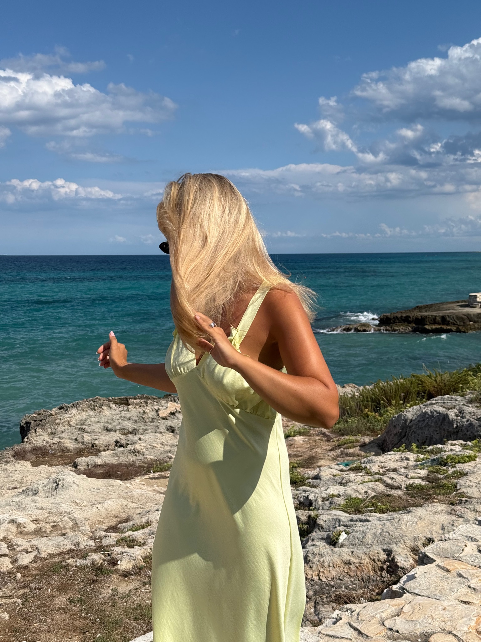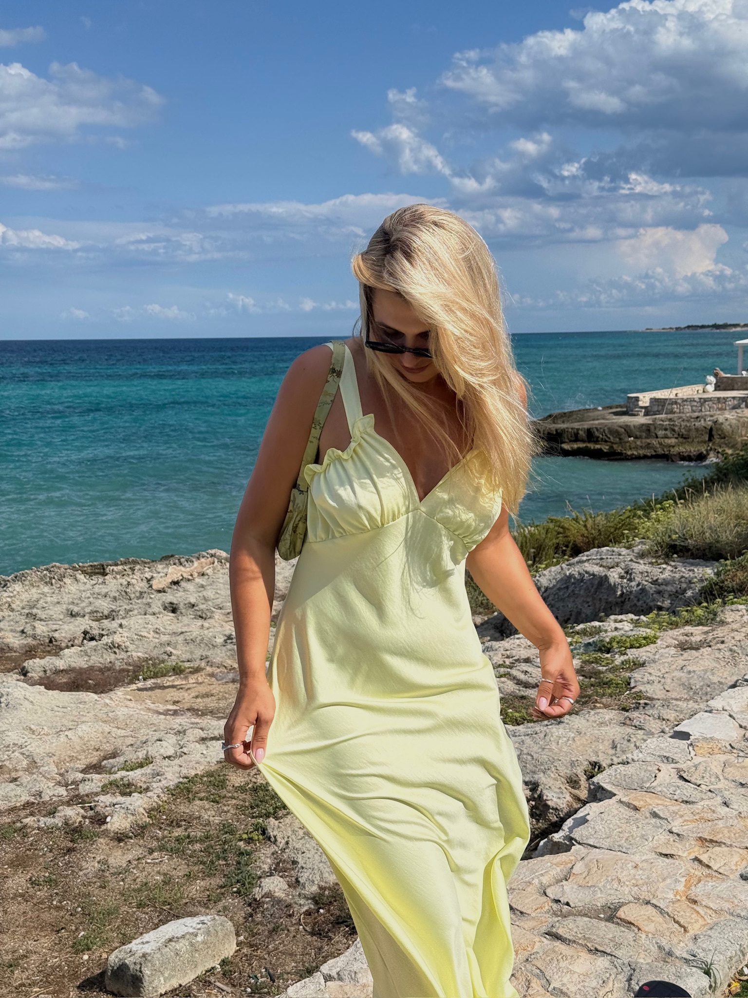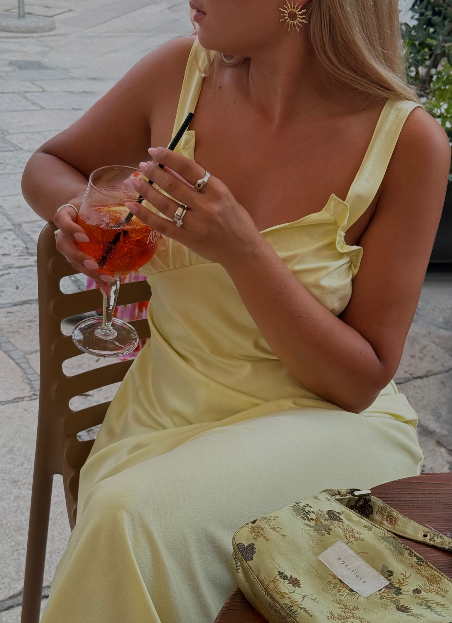 Įsivaizduok saulėtą popietę – ore skamba juokas, o švelni geltona suknelė švyti tarsi saulės šviesa ant tavo odos. Gaivi, šviesi ir lengvai džiuginanti – kaip prisiminimai apie karštas vasaros dienas, kurios virsdavo nepamirštamais vakarais. Ji viena tokia – ikoniškoji citrinų atspalvio Meya: žaisminga ir spindinti. Be galo jausminga, neturinti ką slėpti. Ši suknelė, kaip nė viena kita, išryškina moteriško silueto trapumą ir eleganciją – ji slysta tavo oda tarsi vėsus vanduo, apgaubdama tavo formas ir kiekvieną mažą judesį.