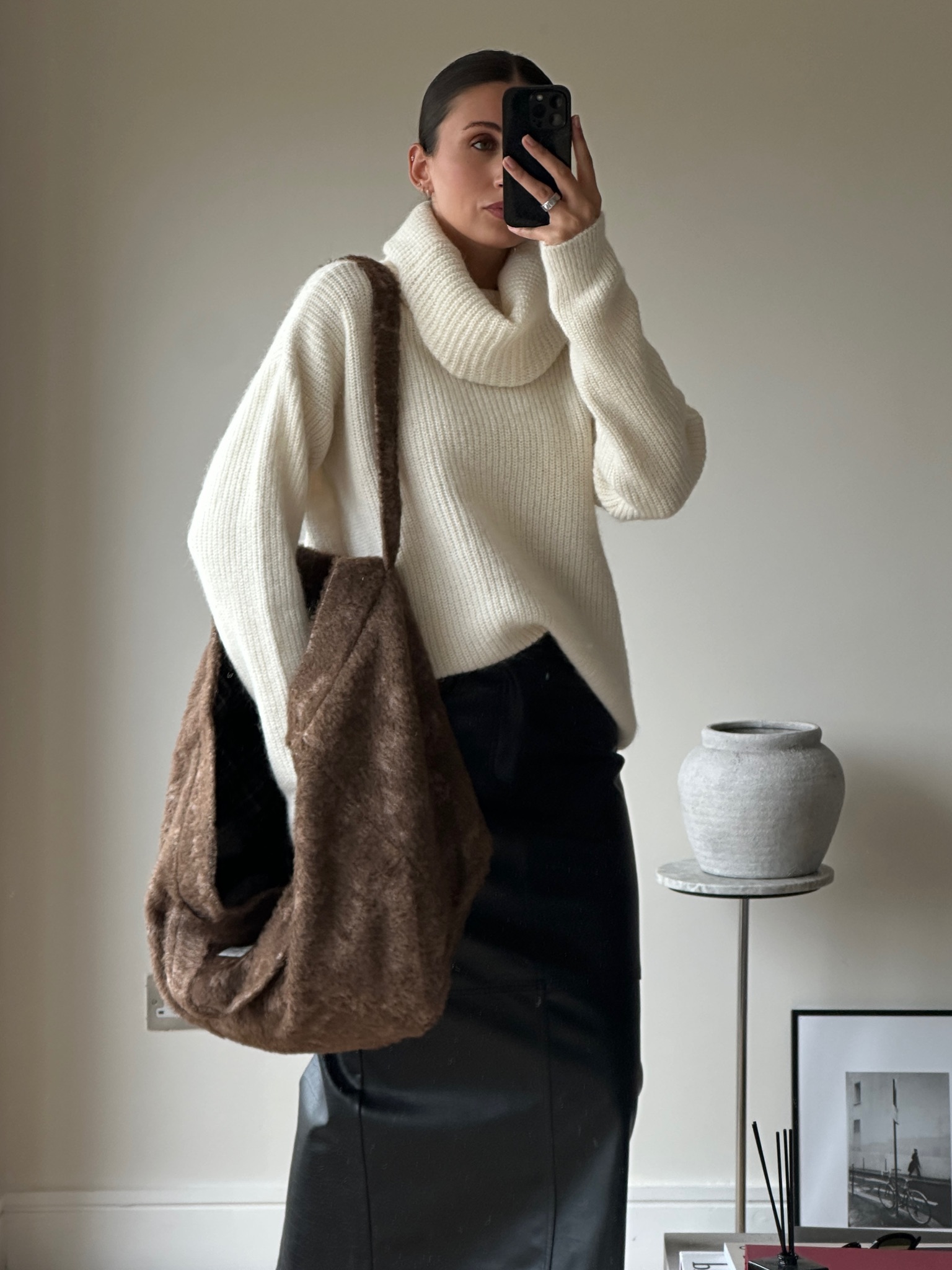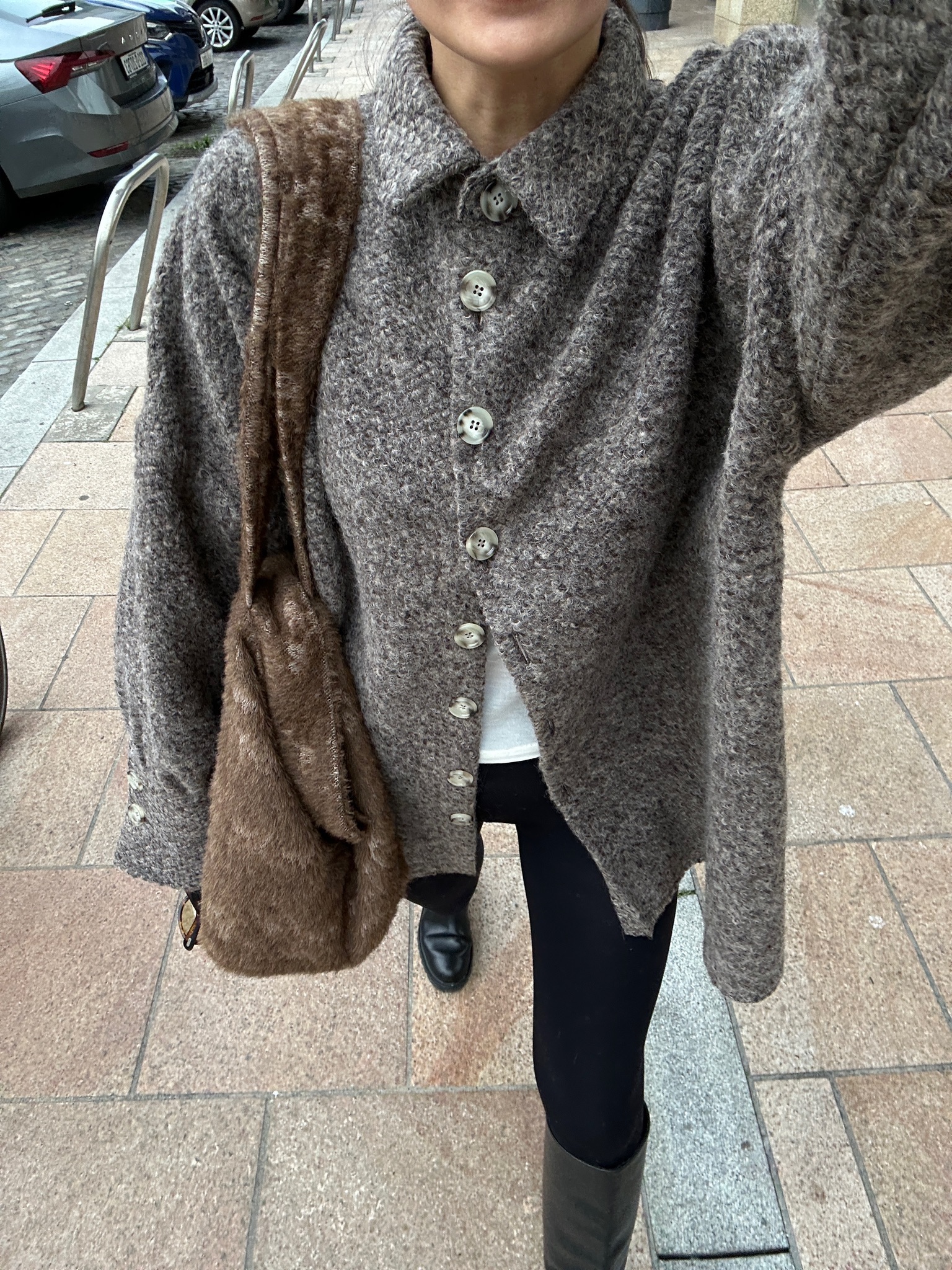 A piece where comfort meets modern style. Handcrafted from luxuriously soft alpaca wool, this bag feels as cozy as it looks. Its plush texture and rich brown hue make it the perfect statement piece for colder months – effortlessly complementing neutral knits, oversized coats, and relaxed silhouettes. Lined with fine merino wool for extra softness and structure, it’s made to carry your everyday essentials in style. Spacious, tactile, and endlessly versatile – this tote adds a warm, modern touch to any look, from slow weekends to busy city days.