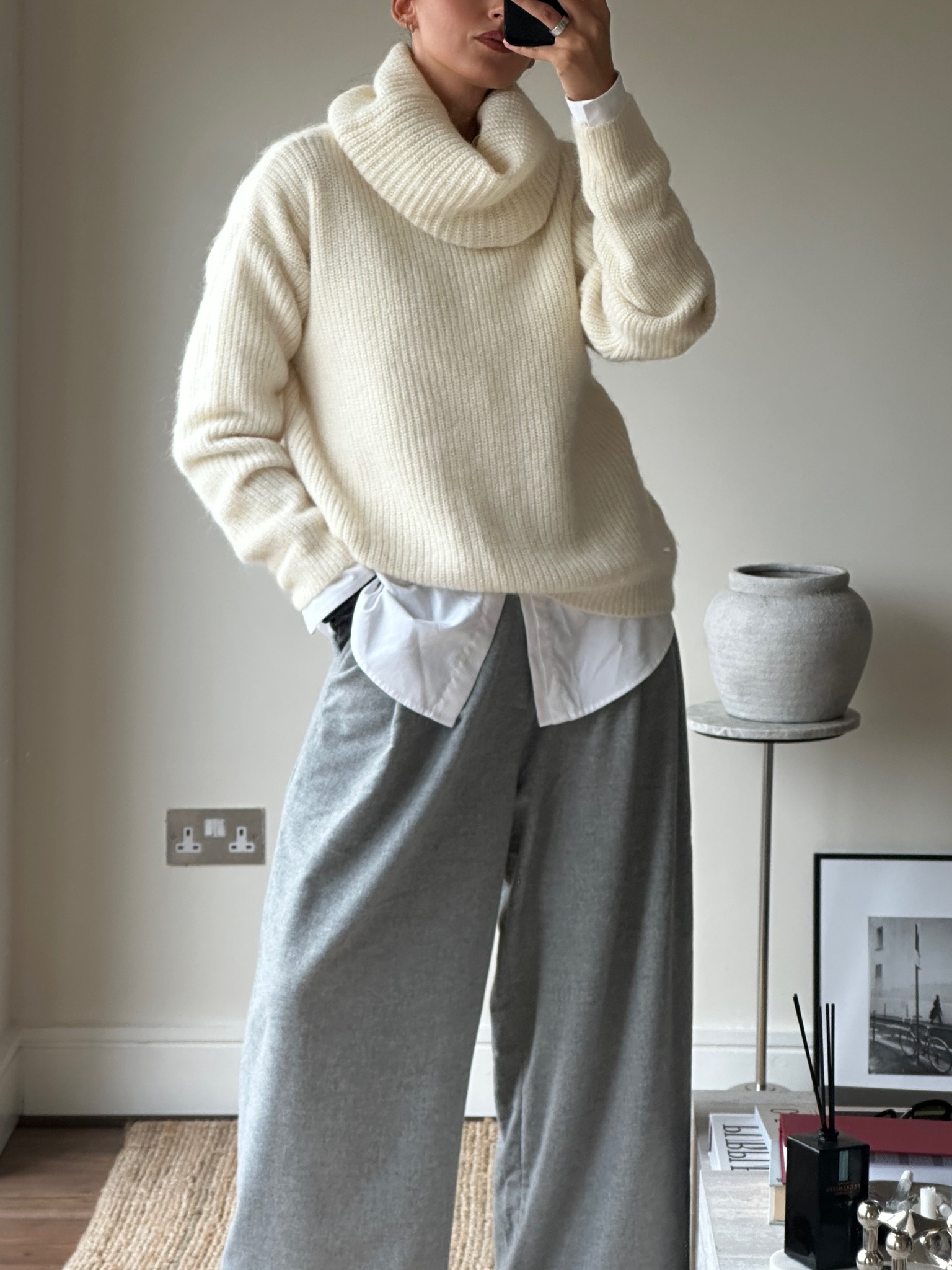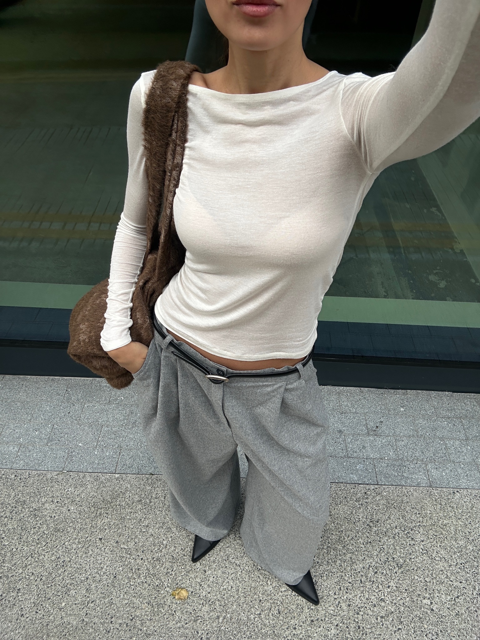 These tailored trousers in a soft light grey tone feel like a breath of calm elegance. Crafted from a luxurious blend of wool and cashmere, they redefine everyday sophistication. The pleated design, low waistline, and wide-leg silhouette move gracefully with you – relaxed yet undeniably classy. Pair them with a chunky knit for slow mornings, a crisp shirt for city strolls, or a soft blazer for effortless polish.