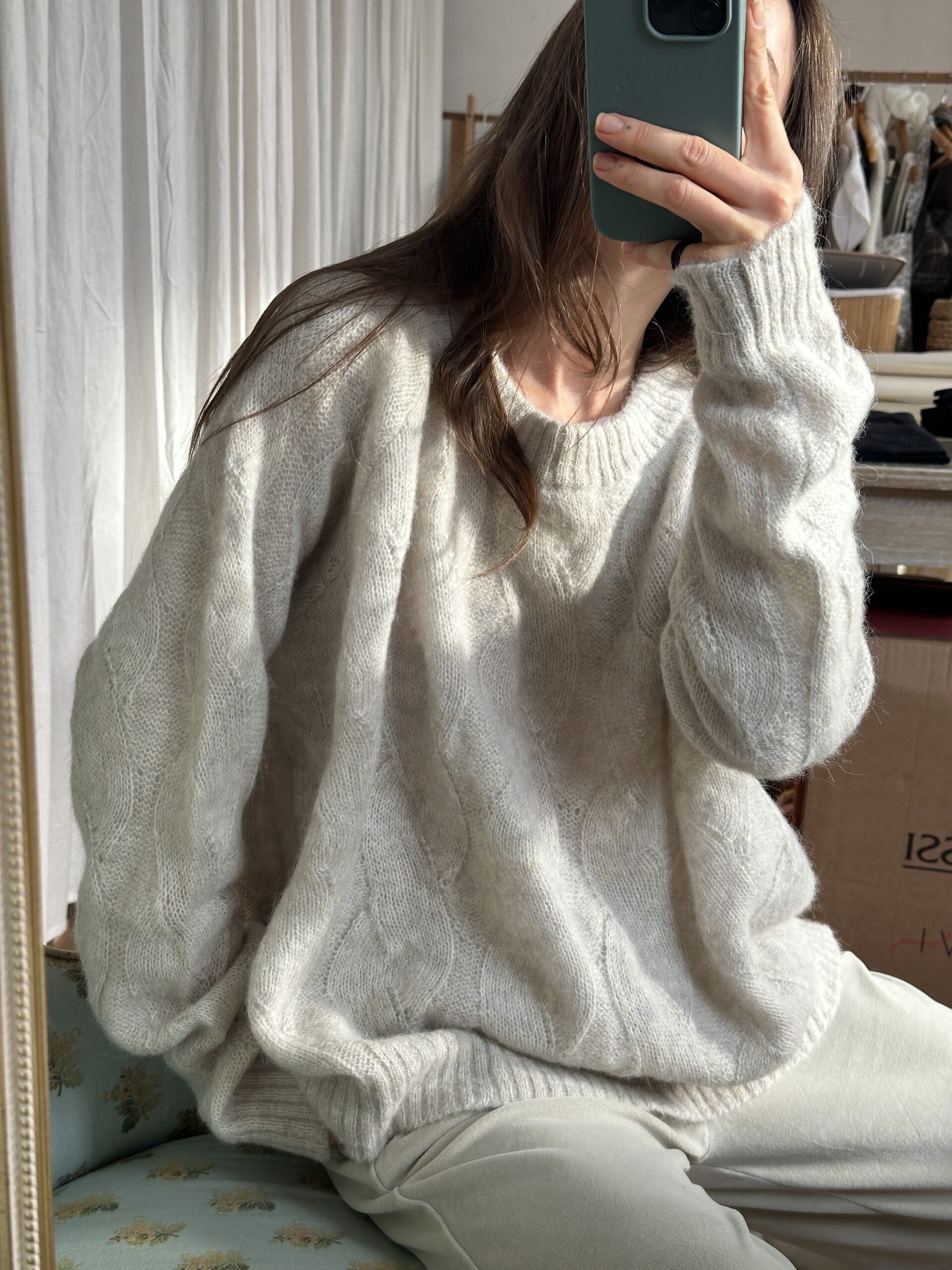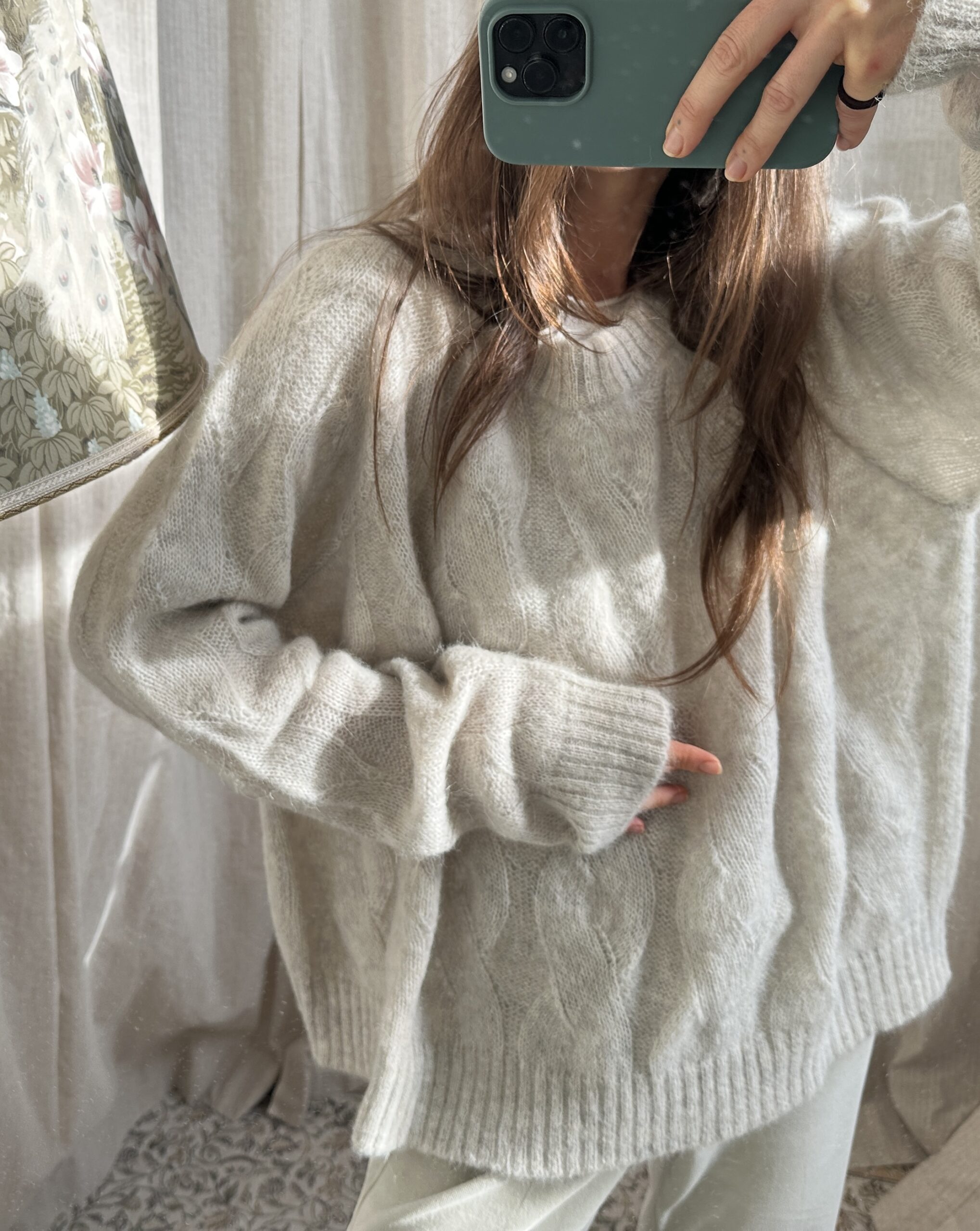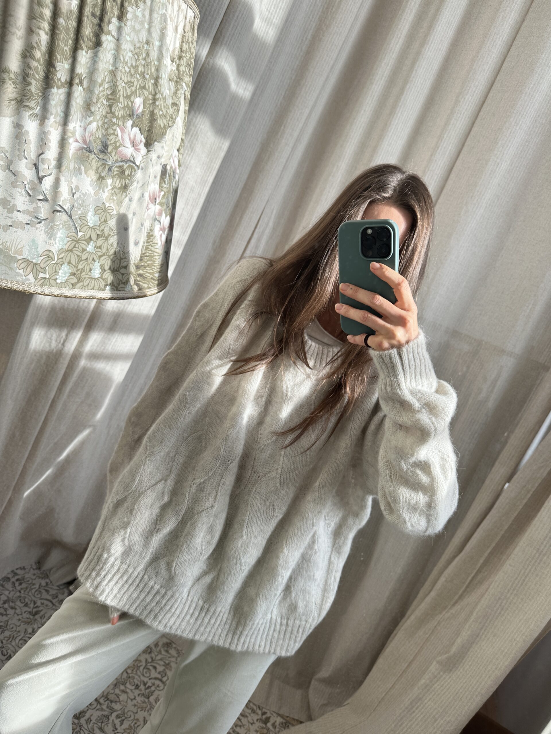 This sweater feels like winter mornings by the window – quiet, soft, and endlessly comforting. Hand-knitted from luxurious mohair and baby alpaca wool, it embraces you in a cloud of warmth. The chunky cable-knit texture adds depth and character, while the relaxed oversized fit invites you to slow down and enjoy the moment. In a timeless grey-cream hue, it’s the definition of effortless style – pairing as beautifully with denim and sneakers as it does with a silk skirt or tailored trousers. Whether you’re strolling through crisp city streets or curling up at home with a cup of coffee, this sweater moves with you – cozy, graceful, and forever classic.
