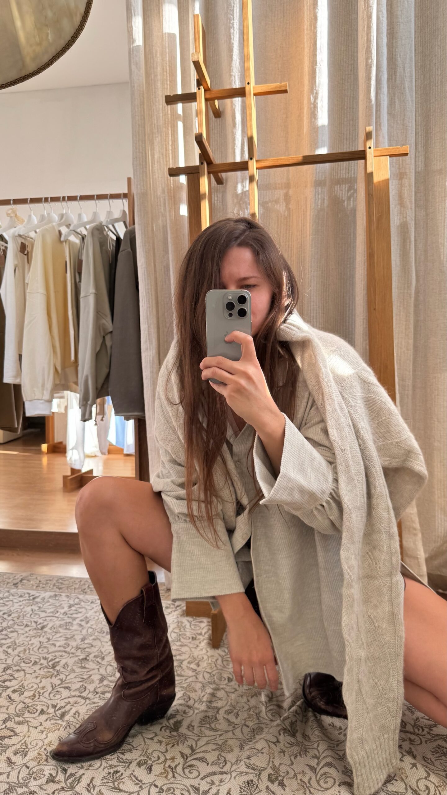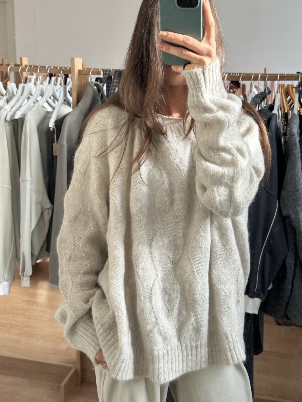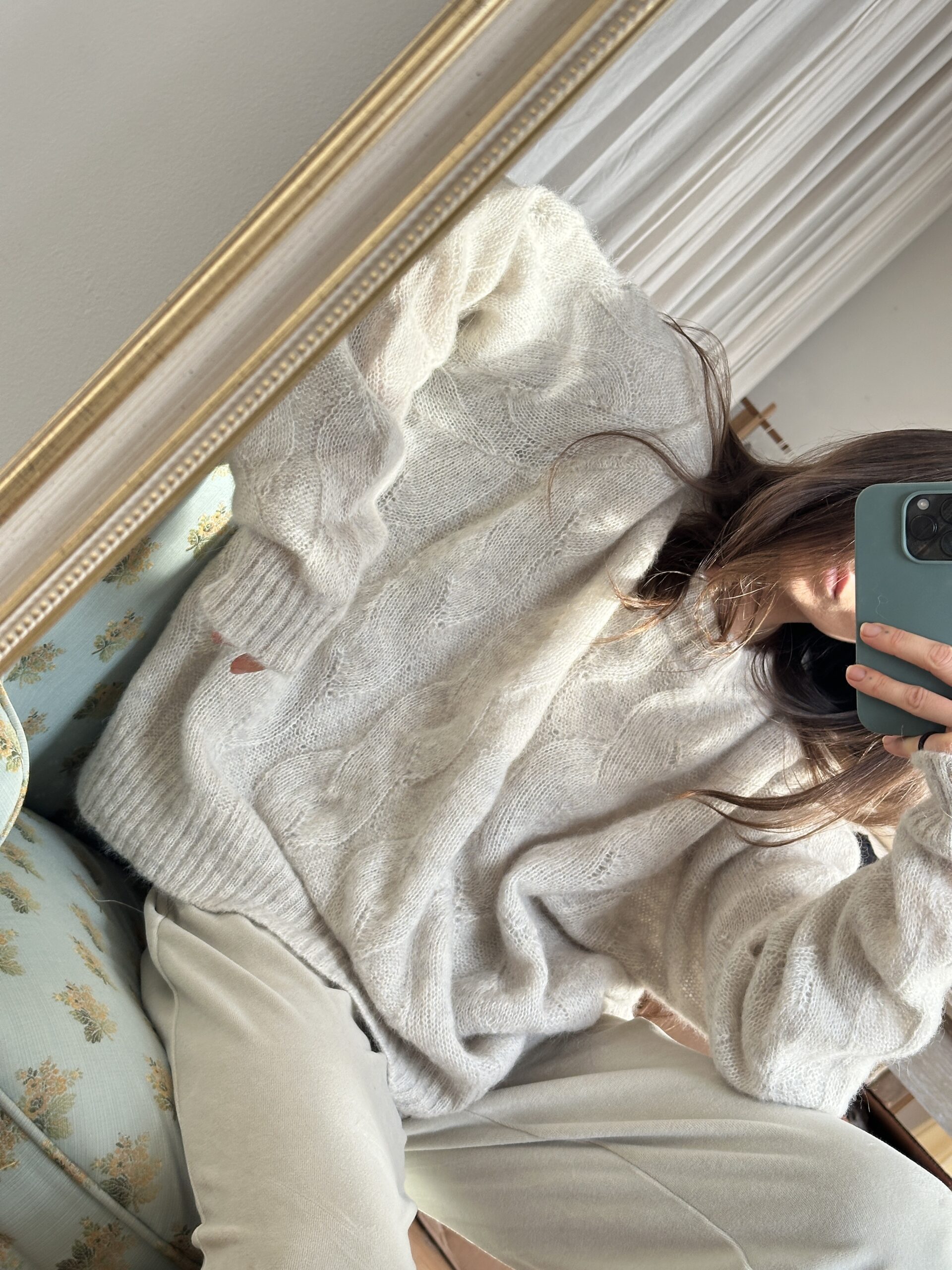 This sweater feels like winter mornings by the window – quiet, soft, and endlessly comforting. Hand-knitted from luxurious mohair and baby alpaca wool, it embraces you in a cloud of warmth. The chunky cable-knit texture adds depth and character, while the relaxed oversized fit invites you to slow down and enjoy the moment. In a timeless grey-cream hue, it’s the definition of effortless style – pairing as beautifully with denim and sneakers as it does with a silk skirt or tailored trousers. Whether you’re strolling through crisp city streets or curling up at home with a cup of coffee, this sweater moves with you – cozy, graceful, and forever classic.
