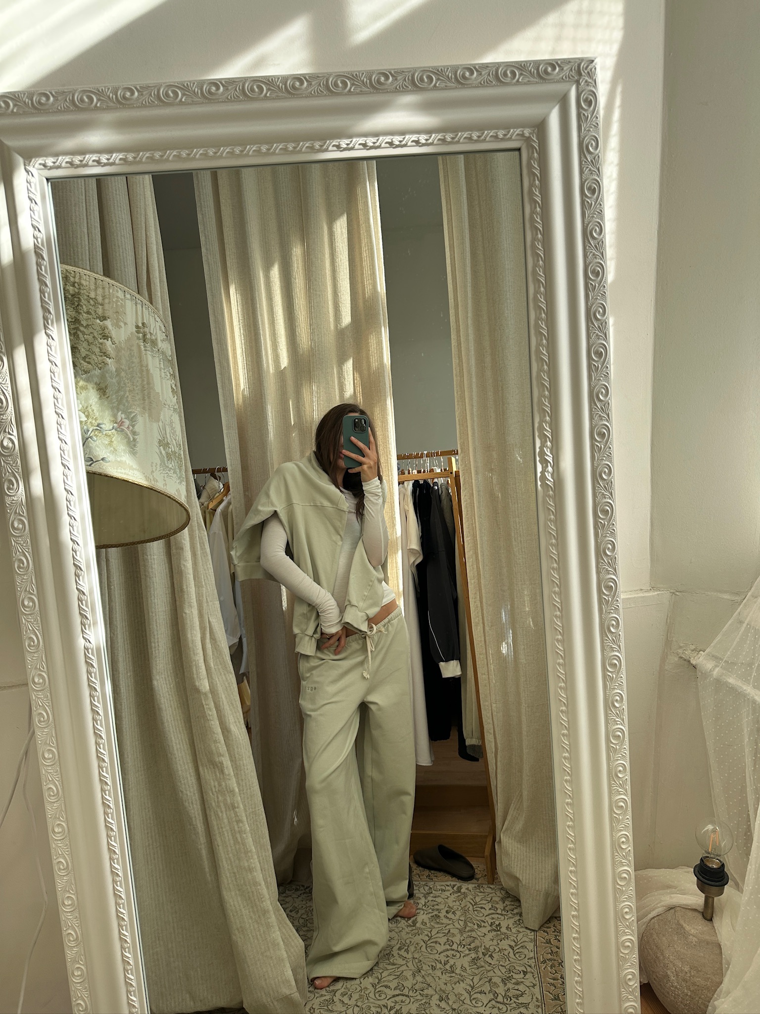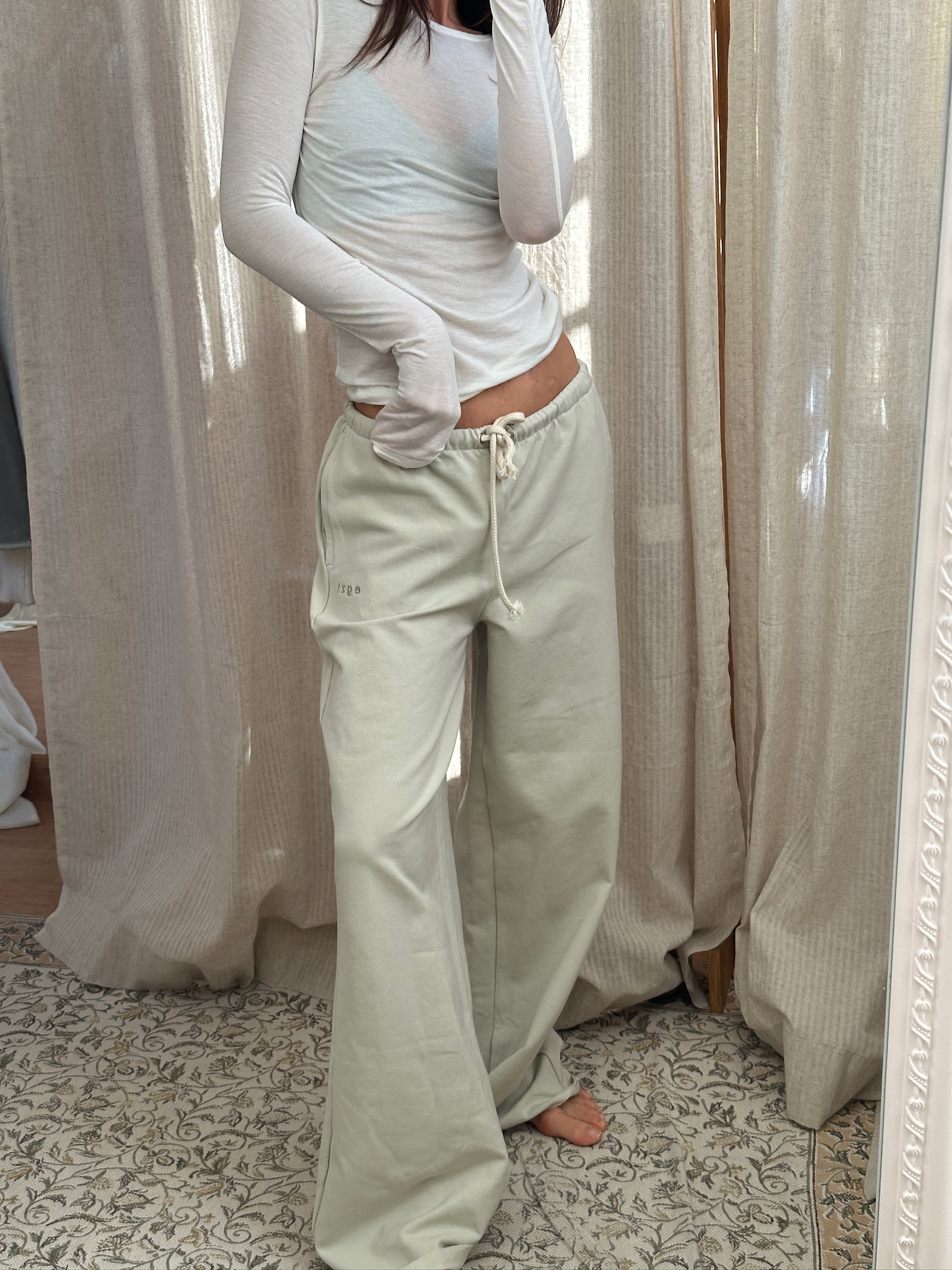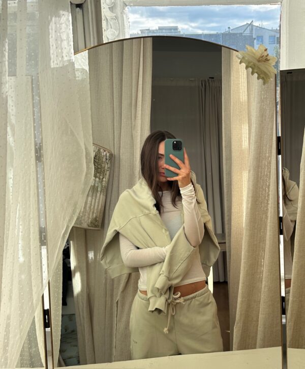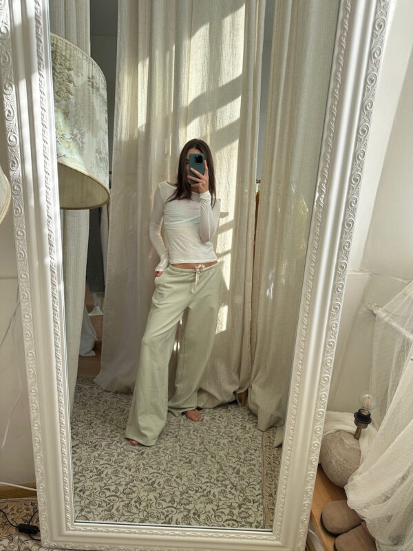 Super lightweight egzt sweatpants in a refreshing pistachio tone is made from premium Netherlands cotton – a breathable, season-perfect choice. Its pastel shade adds a quiet freshness, an airy and soft fabric ensures comfort for warmer autumn days, and wide-leg silhouette guarantees ease of movement and understated charm. Pair them with hoodies, t-shirts, shirts, or even blazers – the classic design ensures everyday comfort while still looking chic.