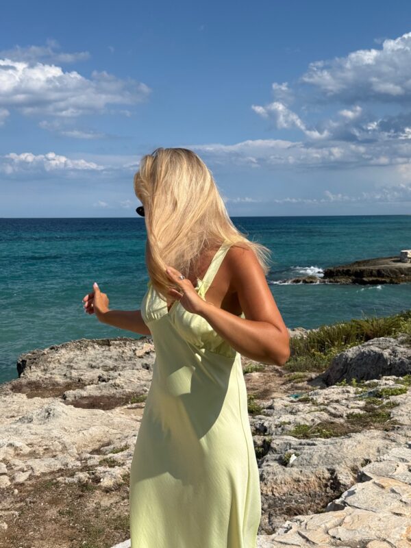 Imagine a sunlit afternoon – laughter in the air and a soft yellow dress glowing like sunlight on your skin. It’s fresh, bright and effortlessly joyful, like memories of hot summer days that turned into unforgetable nights. It’s one of a kind – the iconic Meya in lemon: playful and radiant. Super sensual, with nothing to hide. This dress, like no other, highlights the fragility and elegance of the feminine silhouette – it glides over your skin like cool water, framing your shape and every little move you make.